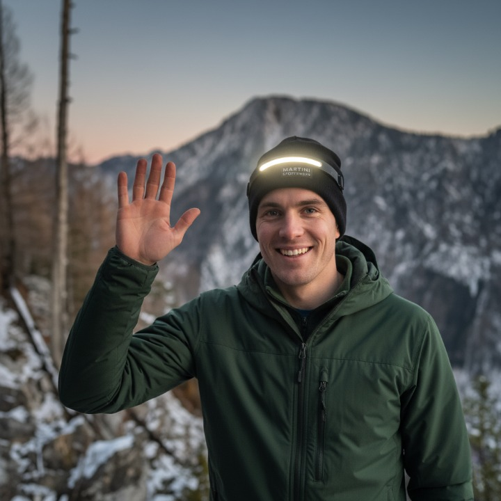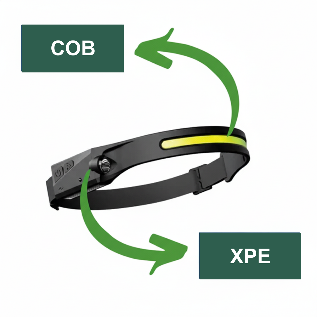 The special feature of our HIKE Headlamp headlamp is the long COB light strip integrated across the forehead.